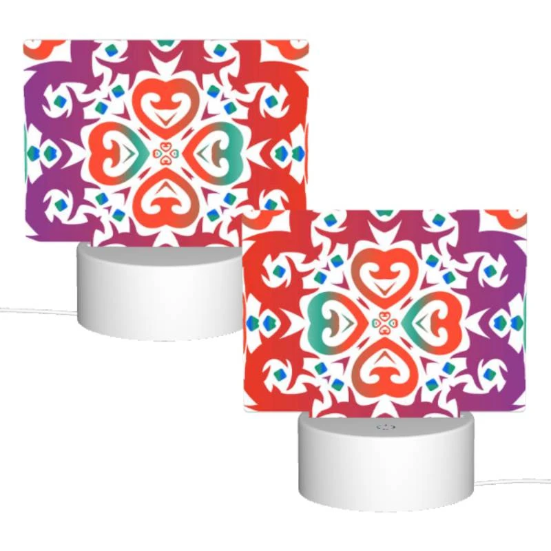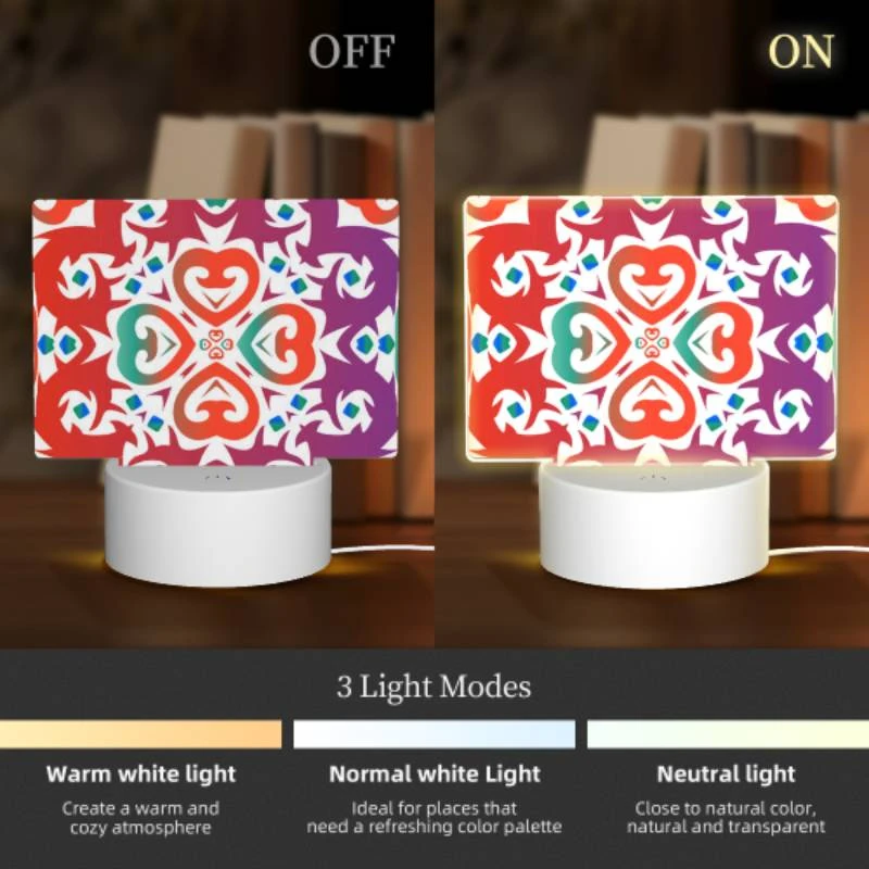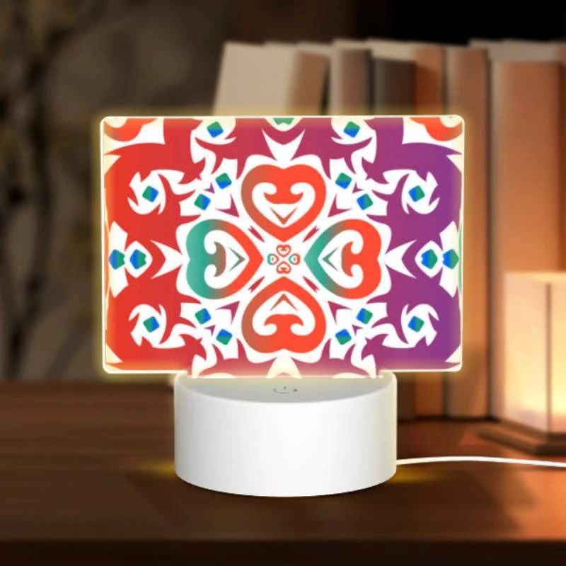 Rectangular Acrylic Night Light, A Colorful Circle With A Yellow Center And Blue And Orange Designs.